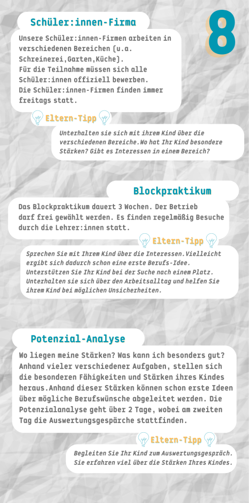 Ein wichtiger Bestandteil sind unsere Praktika, die Einblicke in verschiedene Berufsfelder geben und den Jugendlichen helfen, eigene Interessen und Fähigkeiten zu entdecken. Ergänzend dazu unterstützen Projekte und Beratungsgespräche die Schülerinnen und Schüler dabei, ihre persönlichen Ziele zu entwickeln und nächste Schritte zu planen.