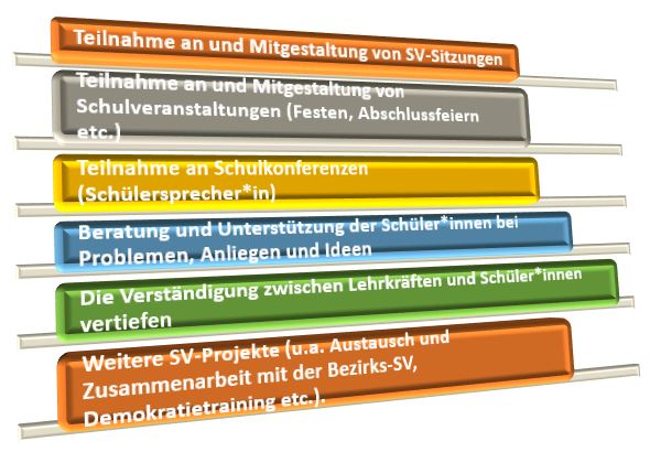 Mitglieder der SV können auf diese Weise die Interessen ihrer Mitschüler*innen und auch ihre eigenen Interessen, Ideen und Wünsche äußern und dazu beitragen, dass diese einer Umsetzung näher kommen. Zudem lernen die Schüler*innen, ihre Meinung begründet zu vertreten sowie über soziale Prozesse im Schulleben nachzudenken und diese an die Mitschüler*innen zurückzumelden. Sie sind dadurch an Teilhabe und Mitgestaltung des Schullebens beteiligt. Die SV ist somit als Teil einer demokratischen Schulstruktur zu verstehen, an der alle Schüler*innen, ihren individuellen Fähigkeiten entsprechend, partizipieren.
